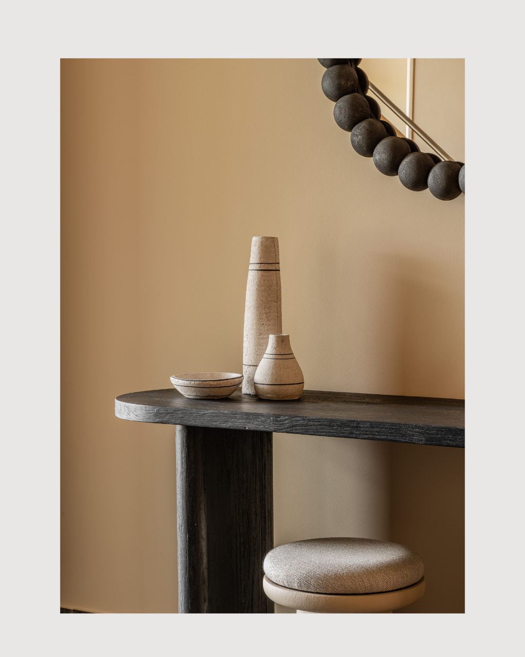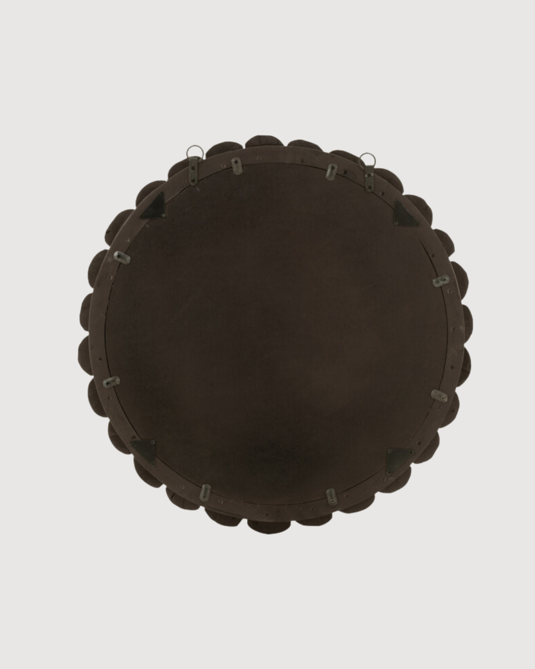 Ronde spiegel met bollen in tropisch hout, brut en gezwart. Ophanging door middel van 2 haakjes. Brengt instant dimensie en karakter aan elke muur.