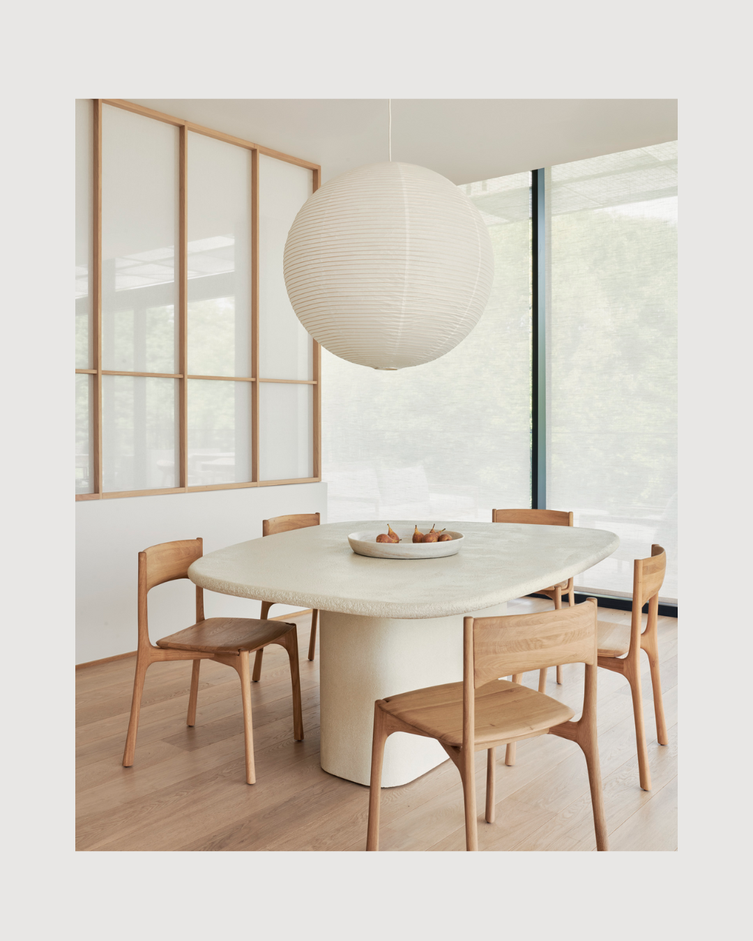 Eettafel met organisch kiezelvormig blad, op centrale poot. Volledig afgewerkt in microcement.